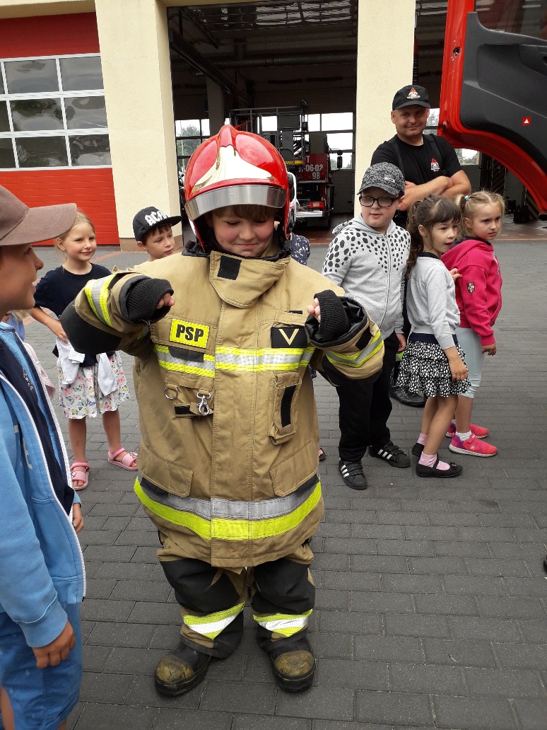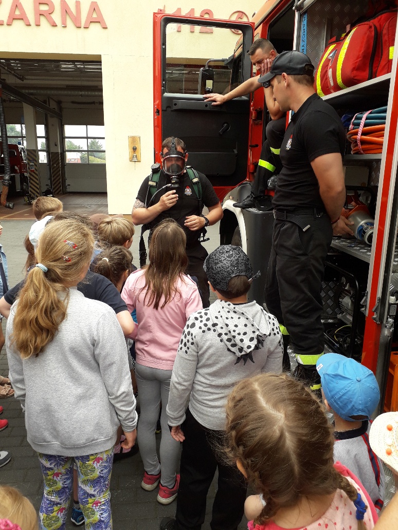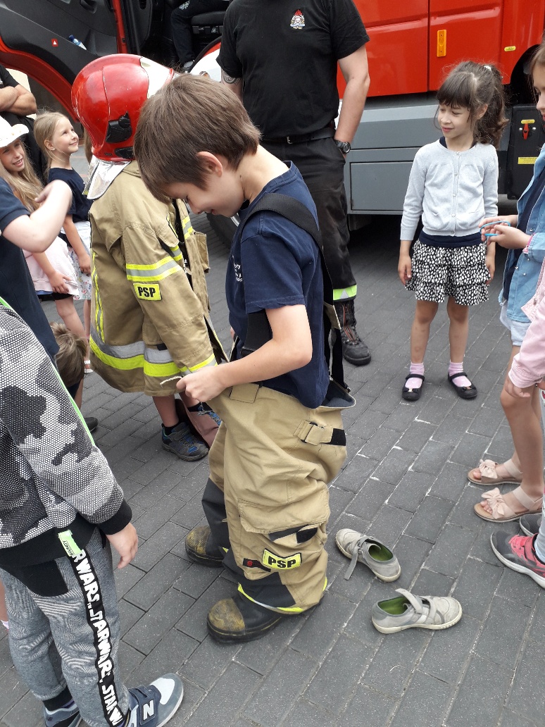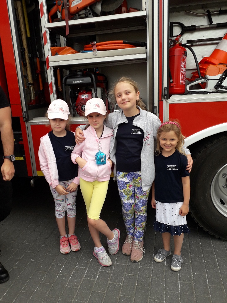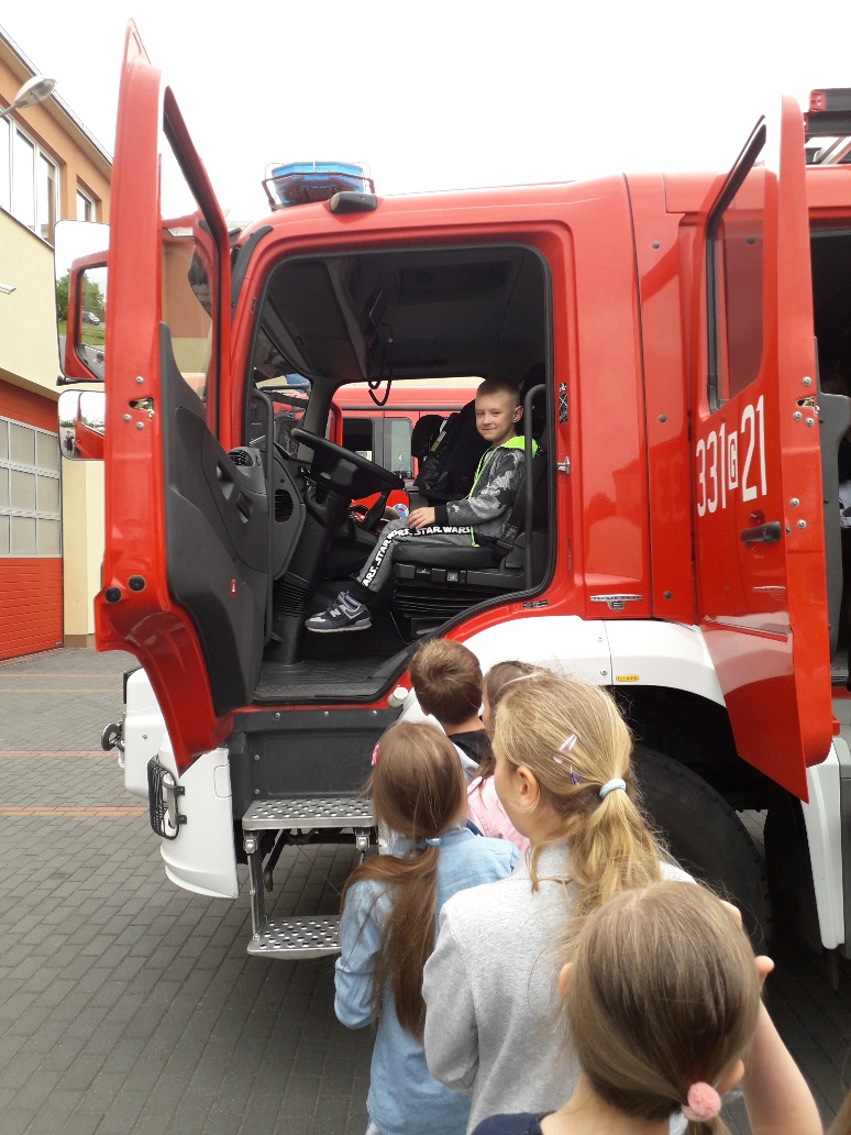 Uczniowie klasy III i zeróweczki uczestniczyli w zajęciach prowadzonych przez strażaków Państwowej Straży Pożarnej w Pruszczu Gdańskim. Na dzieci czekały same atrakcje: zwiedzanie samochodów strażackich, polewanie wodą z hydrantu, przymierzanie stroju strażackiego do gaszenia pożaru. Strażacy przypomnieli w jakich okolicznościach należy wezwać straż pożarną i pod jaki numer zadzwonić.