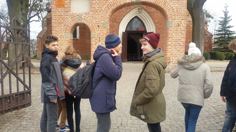 Piotr zaprosił koleżanki i kolegów z klasy II Gimn. na wycieczkę szlakiem ulicy Wojska Polskiego. Opowiedział o dziejach zabytkowego kościoła p.w. Podwyższenia Krzyża Św. i dawnej plebanii. Zaprosił do starego młyna. Zaciekawił historią pierwszej Szkoły w naszym mieście, która mieściła się właśnie przy ul. Wojska Polskiego. Wykazał się świetną znajomością faktów historycznych i umiejętnością wyszukiwania informacji historycznych. Swoją pasją historyczną zaraził rówieśników.